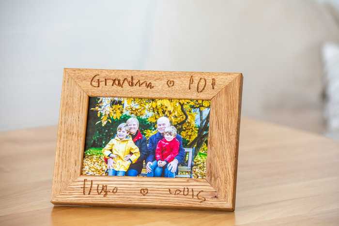 Usually names and dates are used on photo frames as well as children's handwriting which is especially suited to this product. Private 'hidden' messages can also be engraved on the rear of the frames.