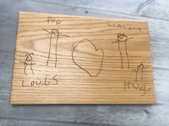 My latest product is was born out of a gift that I made for my parents. My son drew a lovely picture of himself, his brother and my mum and dad and I thought it would be so nice to make it into something that they could keep up forever without fear of it getting damaged, or starting to look tatty. So I engraved it into a gorgeous piece of oak and attached fixings to the back so it could be easily hung. We presented it to my parents who were totally over the moon with this totally unique gift. I’ve decided to add this to my range as it really makes a wonderful present for grandparents.