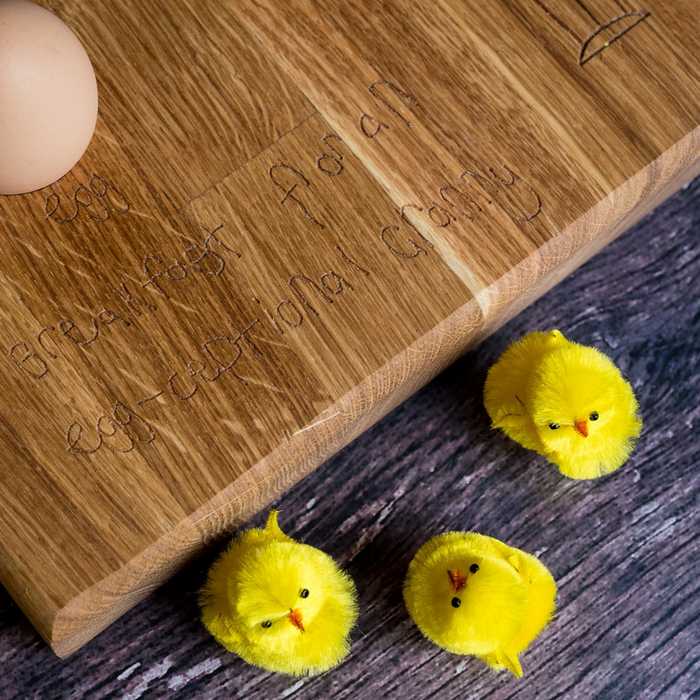 Moving away from chocolates and sweets, if you’re looking for something completely different as an Easter gift then you might like the idea of my personalised egg and soldiers board. They are made of solid oak and you can customize them however you want. Maybe you’ve got an Easter pun or play on words that you would like to write to someone, or perhaps a handwritten message would be good too. I love how one of my customers combined both ideas and presented granny with their very own ‘eggcellent’ egg and soldiers board!